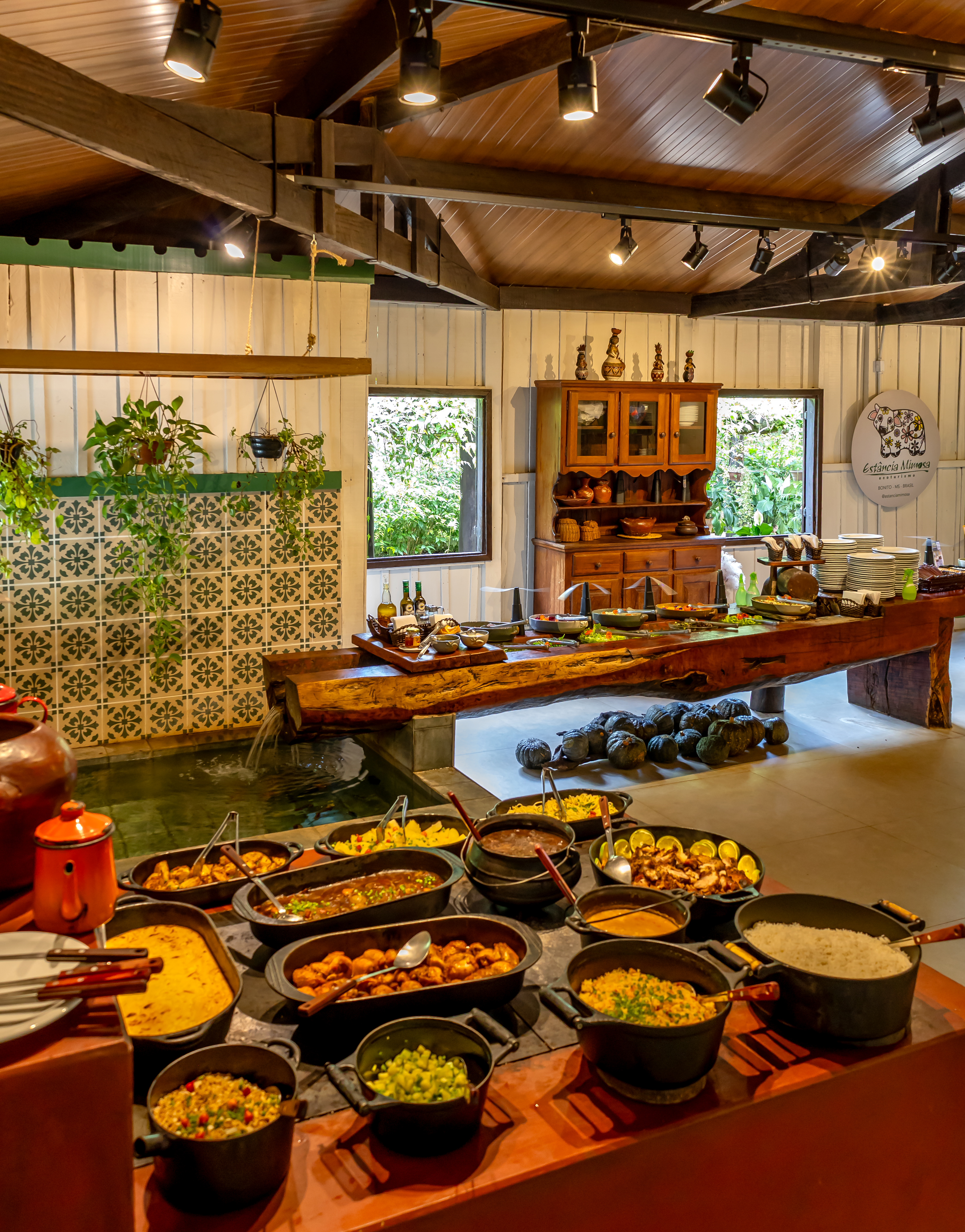 O almoço da Estância Mimosa é servido em fogão a lenha, com pratos caseiros que valorizam a culinária regional de Mato Grosso do Sul. Uma experiência gastronômica que complementa o passeio em meio à natureza preservada de Bonito/MS.