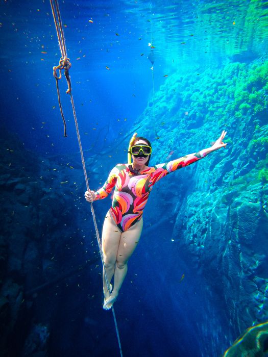 A sensação que se tem ao mergulhar em águas tão transparentes sobre um abismo é de se estar voando, como se você estivesse solto no ar. Você só encontra aqui na Lagoa Misteriosa.